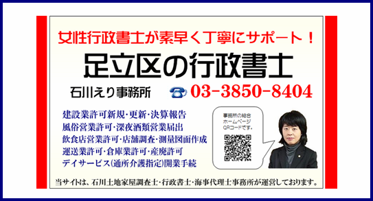建設業許可申請新規・更新・費用建設業許可・決算変更届・電子証明書取得手続建設業許可・経営状況分析審査申請・経営事項審査申請建設工事等入札参加資格審査申請(電子申請)【主な業務エリア】足 立区建設業許可申請新規・更新・費用、葛飾区建設業許可申請新規・更新・費用、江戸川区建設業許可申請新規・更新・費用、板橋区建設業許可申請新規・更 新・費用、豊島区建設業許可申請新規・更新・費用、北区建設業許可申請新規・更新・費用、荒川区建設業許可申請新規・更新・費用、練馬区建設業許可申請新 規・更新・費用、千代田区建設業許可申請新規・更新・費用、中央区建設業許可申請新規・更新・費用、文京区建設業許可申請新規・更新・費用、港区建設業許 可申請新規・更新・費用、台東区建設業許可申請新規・更新・費用、墨田区建設業許可申請新規・更新・費用、江東区建設業許可申請新規・更新・費用、品川区 建設業許可申請新規・更新・費用、大田区建設業許可申請新規・更新・費用、世田谷区建設業許可申請新規・更新・費用、渋谷区建設業許可申請新規・更新・費 用、目黒区建設業許可申請新規・更新・費用、新宿区建設業許可申請新規・更新・費用、中野区建設業許可申請新規・更新・費用、杉並区建設業許可申請新規・ 更新・費用、八王子市建設業許可・経営状況分析審査申請・経営事項審査申請、日野市建設業許可・経営状況分析審査申請・経営事項審査申請、多摩市建設業許 可・経営状況分析審査申請・経営事項審査申請、稲城市建設業許可・経営状況分析審査申請・経営事項審査申請、町田市建設業許可・経営状況分析審査申請・経 営事項審査申請、立川市建設業許可・経営状況分析審査申請・経営事項審査申請、昭島市建設業許可・経営状況分析審査申請・経営事項審査申請、武蔵村山市建 設業許可・経営状況分析審査申請・経営事項審査申請、東大和市建設業許可・経営状況分析審査申請・経営事項審査申請、青梅市建設業許可・経営状況分析審査 申請・経営事項審査申請、あきる野市建設業許可・経営状況分析審査申請・経営事項審査申請、五日市建設業許可・経営状況分析審査申請・経営事項審査申請、 福生市建設業許可・経営状況分析審査申請・経営事項審査申請、羽村市建設業許可・経営状況分析審査申請・経営事項審査申請、府中市建設業許可・経営状況分 析審査申請・経営事項審査申請、小金井市建設業許可・経営状況分析審査申請・経営事項審査申請、国分寺市建設業許可・経営状況分析審査申請・経営事項審査 申請、国立市建設業許可・経営状況分析審査申請・経営事項審査申請、調布市建設業許可・経営状況分析審査申請・経営事項審査申請、狛江市建設業許可・経営 状況分析審査申請・経営事項審査申請、武蔵野市建設業許可・経営状況分析審査申請・経営事項審査申請、三鷹市建設業許可・経営状況分析審査申請・経営事項 審査申請、小平市建設業許可・経営状況分析審査申請・経営事項審査申請、東村山市建設業許可・経営状況分析審査申請・経営事項審査申請、西東京市建設業許 可・経営状況分析審査申請・経営事項審査申請、清瀬市建設業許可・経営状況分析審査申請・経営事項審査申請、東久留米市建設業許可・経営状況分析審査申 請・経営事項審査申請八潮市建設業許可・決算変更届・電子証明書取 得手続、草加市建設業許可・決算変更届・電子証明書取得手続、三郷市建設業許可・決算変更届・電子証明書取得手続、越谷市建設業許可・決算変更届・電子証 明書取得手続、春日部市建設業許可・決算変更届・電子証明書取得手続、戸田市建設業許可・決算変更届・電子証明書取得手続、蕨市建設業許可・決算変更届・ 電子証明書取得手続、川口市建設業許可・決算変更届・電子証明書取得手続、鳩ヶ谷市建設業許可・決算変更届・電子証明書取得手続、志木市建設業許可・決算 変更届・電子証明書取得手続、朝霞市建設業許可・決算変更届・電子証明書取得手続、和光市建設業許可・決算変更届・電子証明書取得手続、新座市建設業許 可・決算変更届・電子証明書取得手続、富士見市建設業許可・決算変更届・電子証明書取得手続、上尾市建設業許可・決算変更届・電子証明書取得手続、桶川市 建設業許可・決算変更届・電子証明書取得手続、久喜市建設業許可・決算変更届・電子証明書取得手続、幸手市建設業許可・決算変更届・電子証明書取得手続、 北葛飾郡建設業許可・決算変更届・電子証明書取得手続、加須市建設業許可・決算変更届・電子証明書取得手続、羽生市建設業許可・決算変更届・電子証明書取 得手続、吉川市建設業許可・決算変更届・電子証明書取得手続、蓮田市建設業許可・決算変更届・電子証明書取得手続、川越市建設工事等入札参加資格審査申請 (電子申請)、ふじみ野市建設工事等入札参加資格審査申請(電子申請)、入間郡建設工事等入札参加資格審査申請(電子申請)、坂戸市建設工事等入札参加資 格審査申